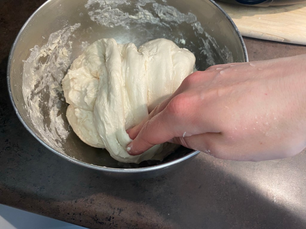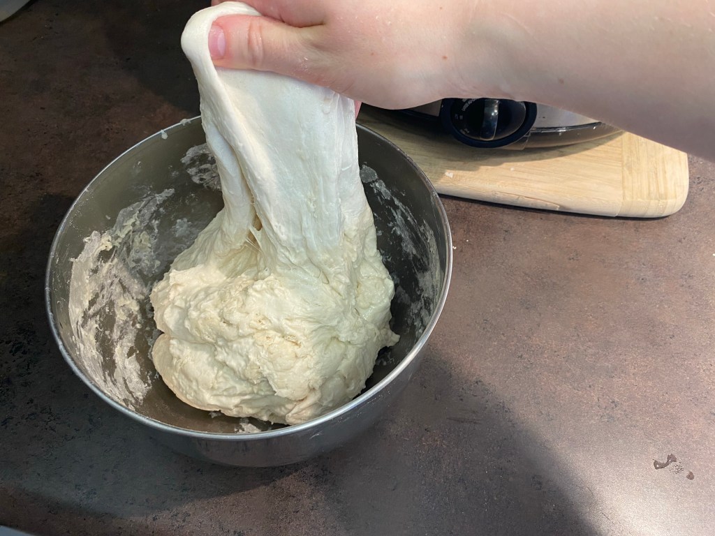 - Note: If it is stiff at first, you can pick it up and gently stretch a little with your wet hands to encourage the gluten. *See picture.