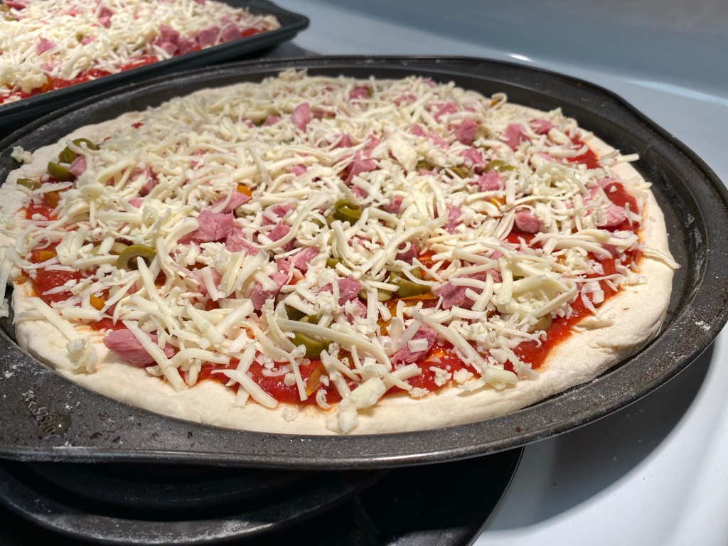 - Put pizza pans in the fridge for minimum 1 hour, or for several until closer to when you want to bake the pizzas off. I like to get it all prepped up to this point in the morning, then it’s just a quick decorate and bake before dinner.