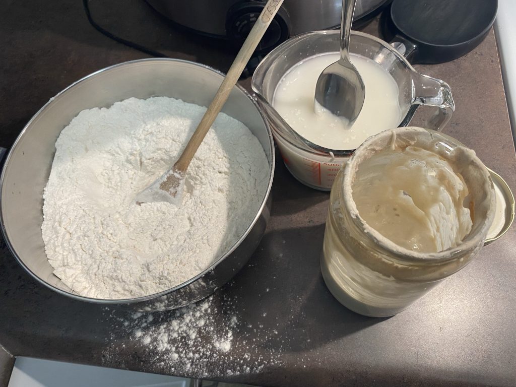 Sourdough is made using a fermented mixture of flour and water, called the “starter”, and mixed with more water, flour, and usually salt. The dough naturally rises as it ferments during resting stages. There is a lower amount of gluten in sourdough baking, which is why the dough needs to be “stretched” multiple times to help it expand and become fluffy.