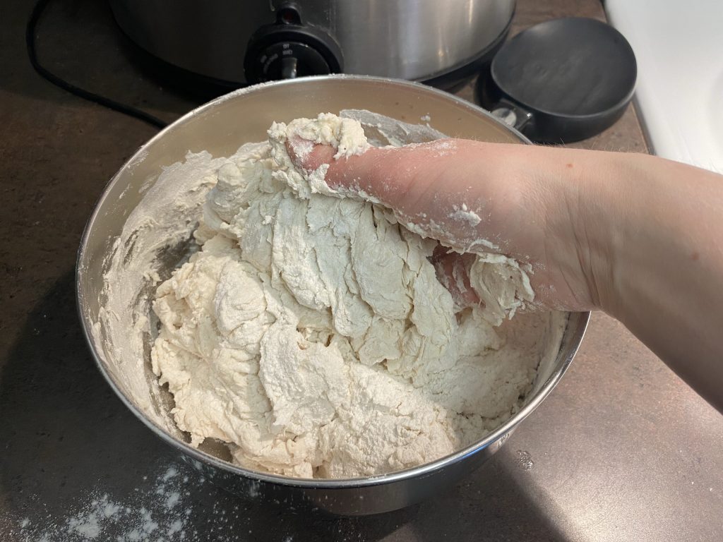 - Mix the flour and salt together in larger bowl, then add the wet ingredients and stir together until it forms a sticky ball. I find it easier to finish mixing it with my hands. If it is dry, resist the urge to add any water!