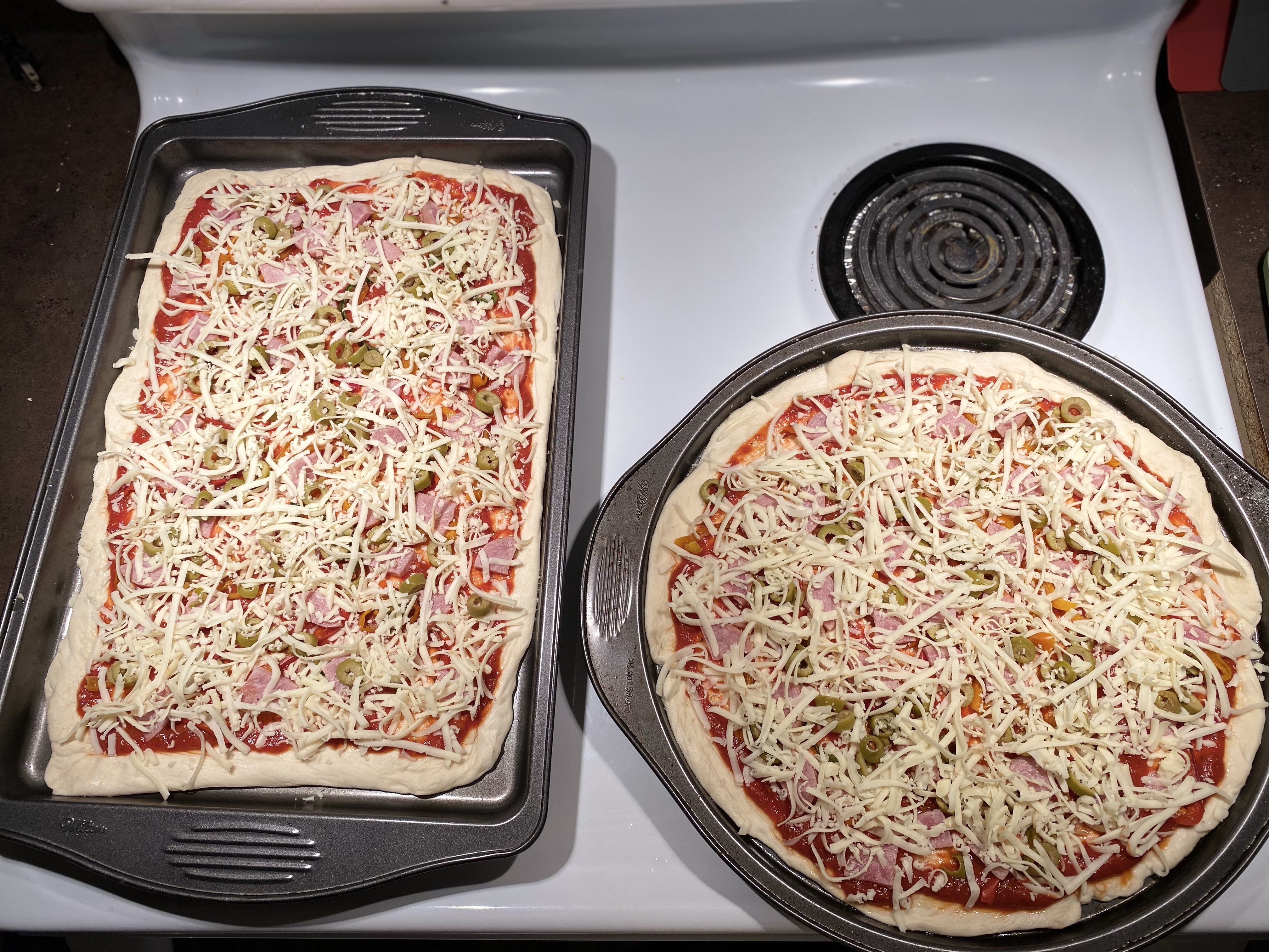 - Separate the dough into two balls. Roll out on lightly floured counter and press into prepared pizza pans.