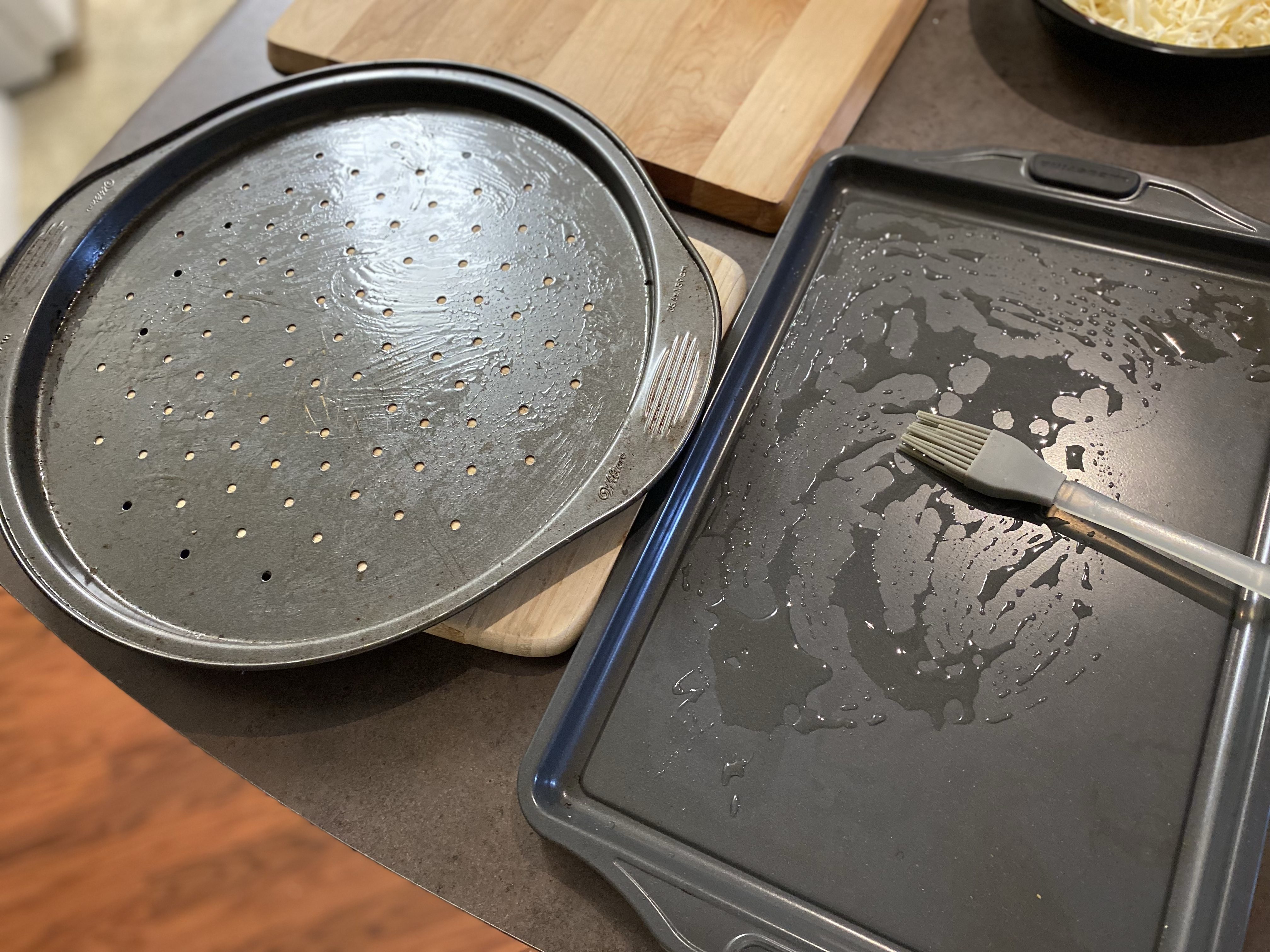 - Grease pizza pans with olive oil, and sprinkle cornmeal onto it to help the bottom not to stick later.