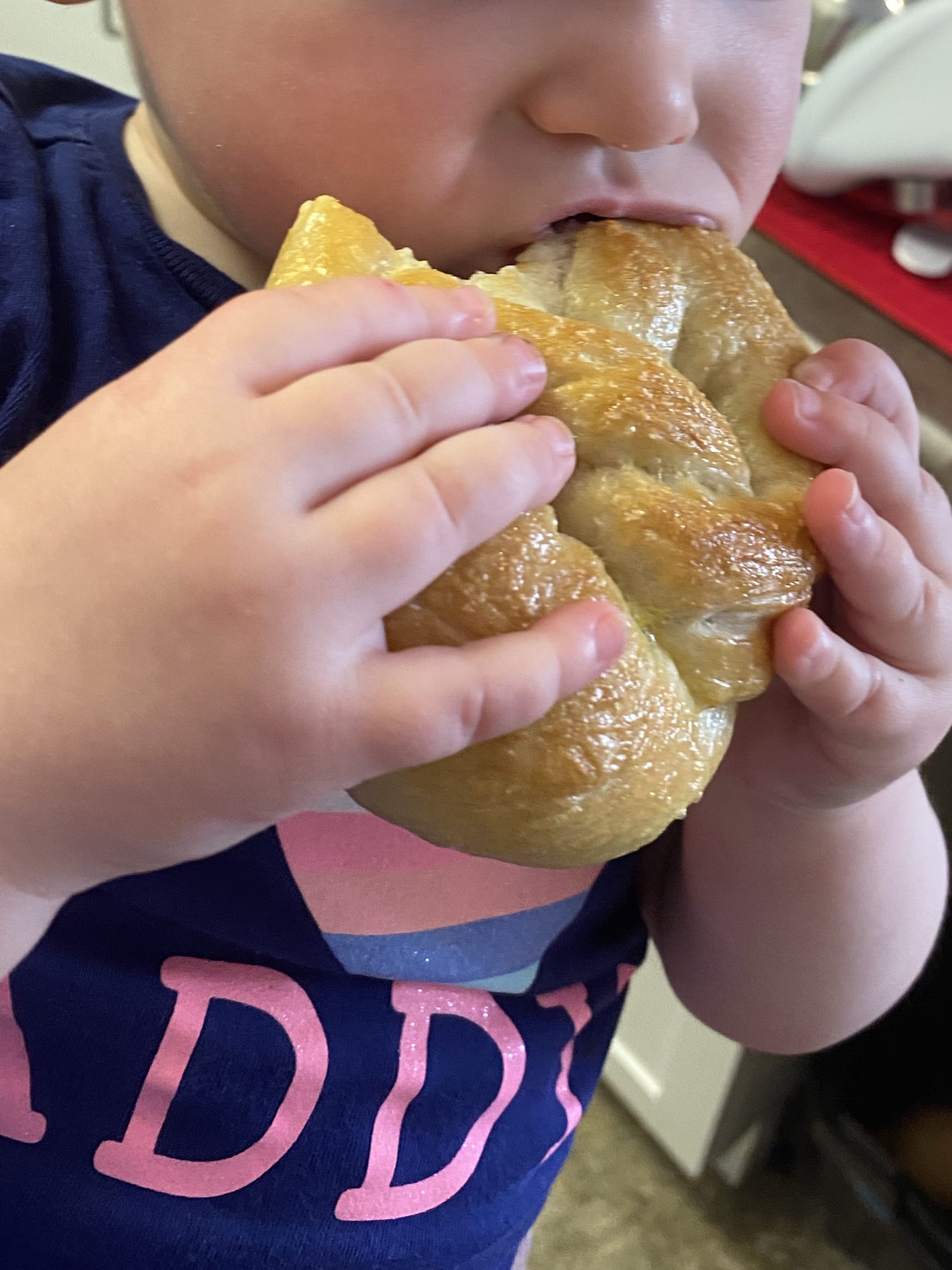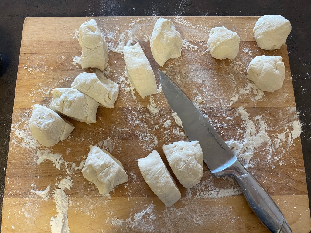 - Knead dough on floured surface for 2 minutes until it is a soft ball. Form it into a “log” and divide and cut into 12 pieces.