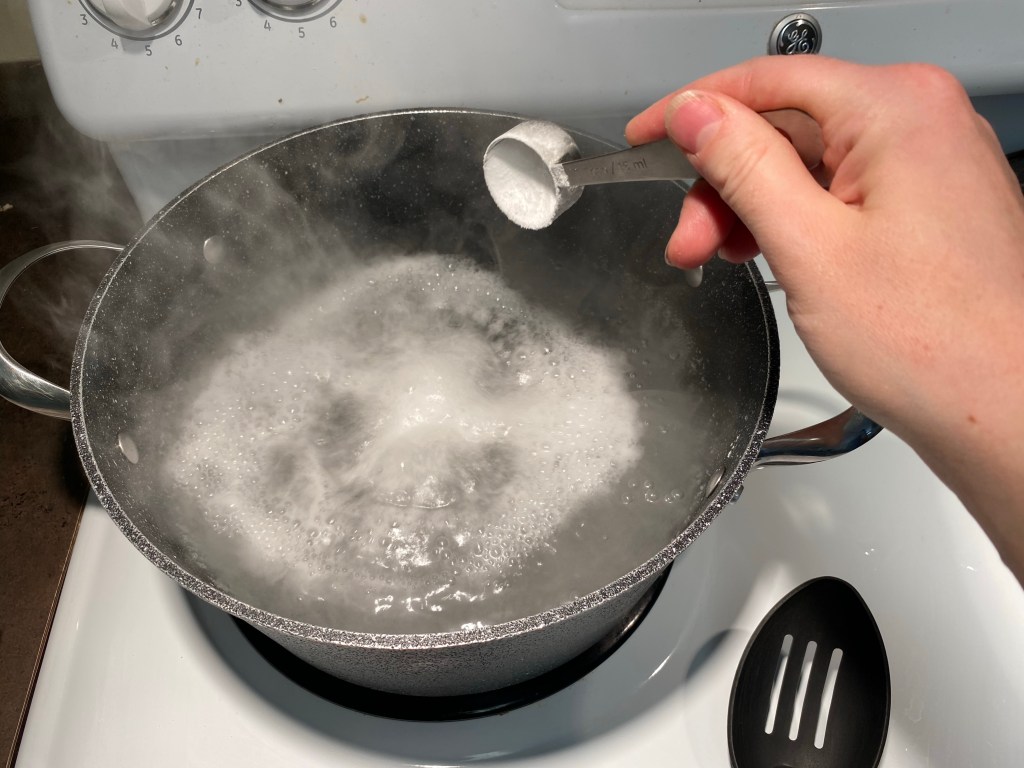 - Boil 6 cups of water in a large pot and add baking soda and sugar. When it is a rolling boil, add 3-4 pretzels gently with a large slotted spoon.