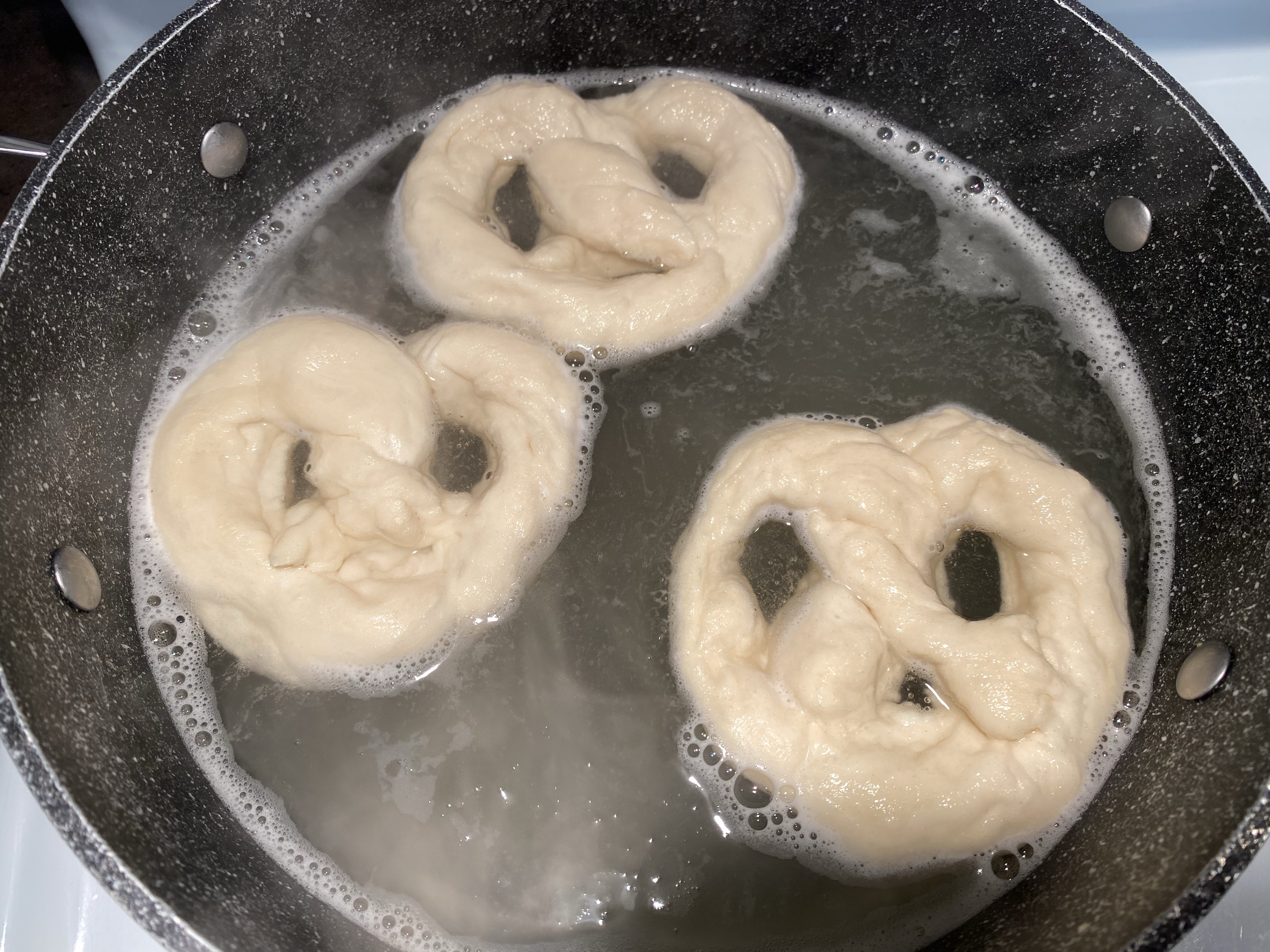 7. Boil 6 cups of water in a large pot and add baking soda and sugar. When it is a rolling boil, add 3-4 pretzels gently with a large slotted spoon.