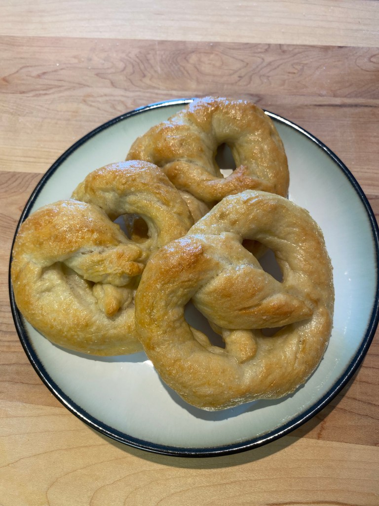 10. Bake pretzels on middle rack in oven for 14-16 minutes or until golden brown on top and bottom. Let cool on baking sheets or rest at least 10 minutes before biting into. Enjoy!