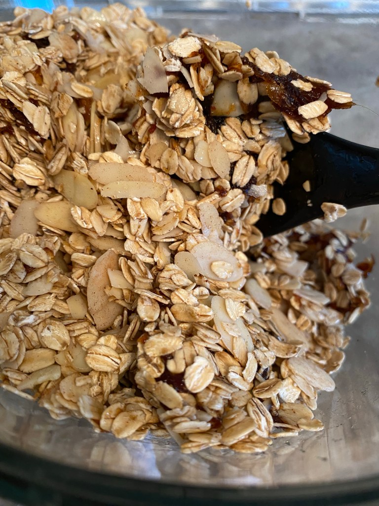 - Mix the oats, almonds and cinnamon together in a large bowl. Set aside.