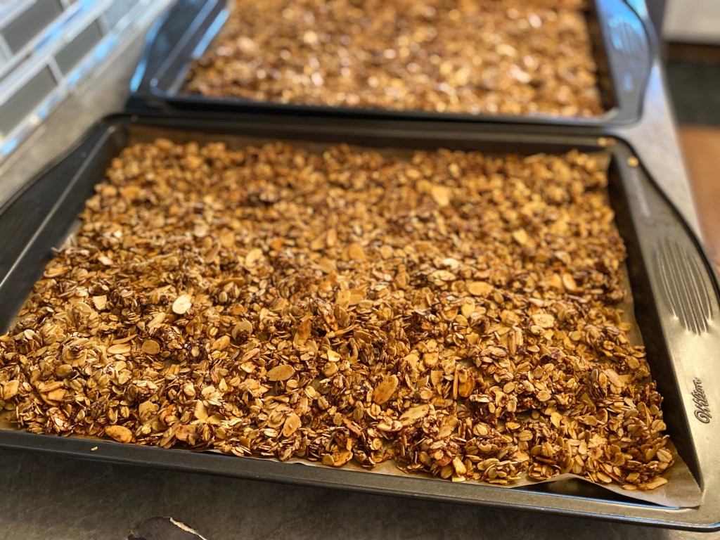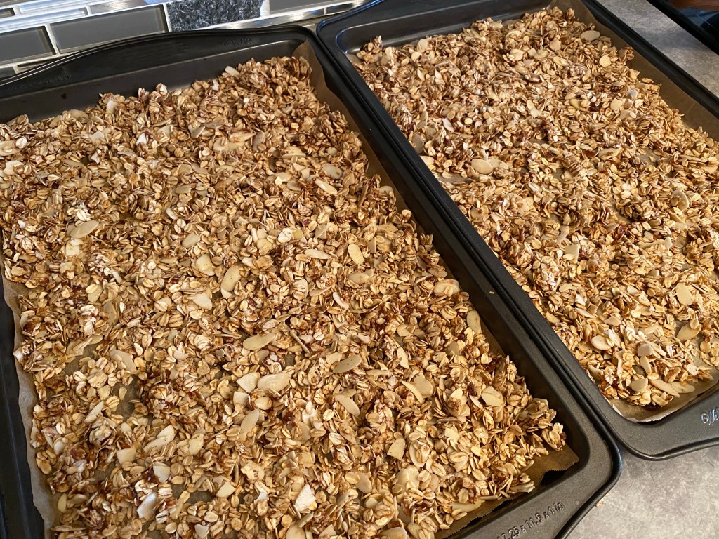 - Spread granola mix onto parchment covered cookie sheets. Granola should be in a single layer.