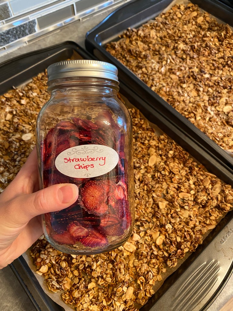 After our trip to a local strawberry farm and sharing last week about how to dehydrate strawberries, I’ve been having some fun developing ways to enjoy the dried strawberries (other than the fam and I simply snacking on them as chips!).