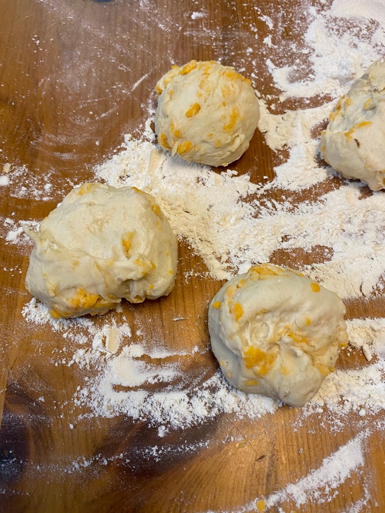 - Add 1 cup of cheese to bowl and work it into the dough. Knead dough on floured surface for 2 minutes until it is a soft ball. Form it into a “log” and divide and cut into 12 pieces.