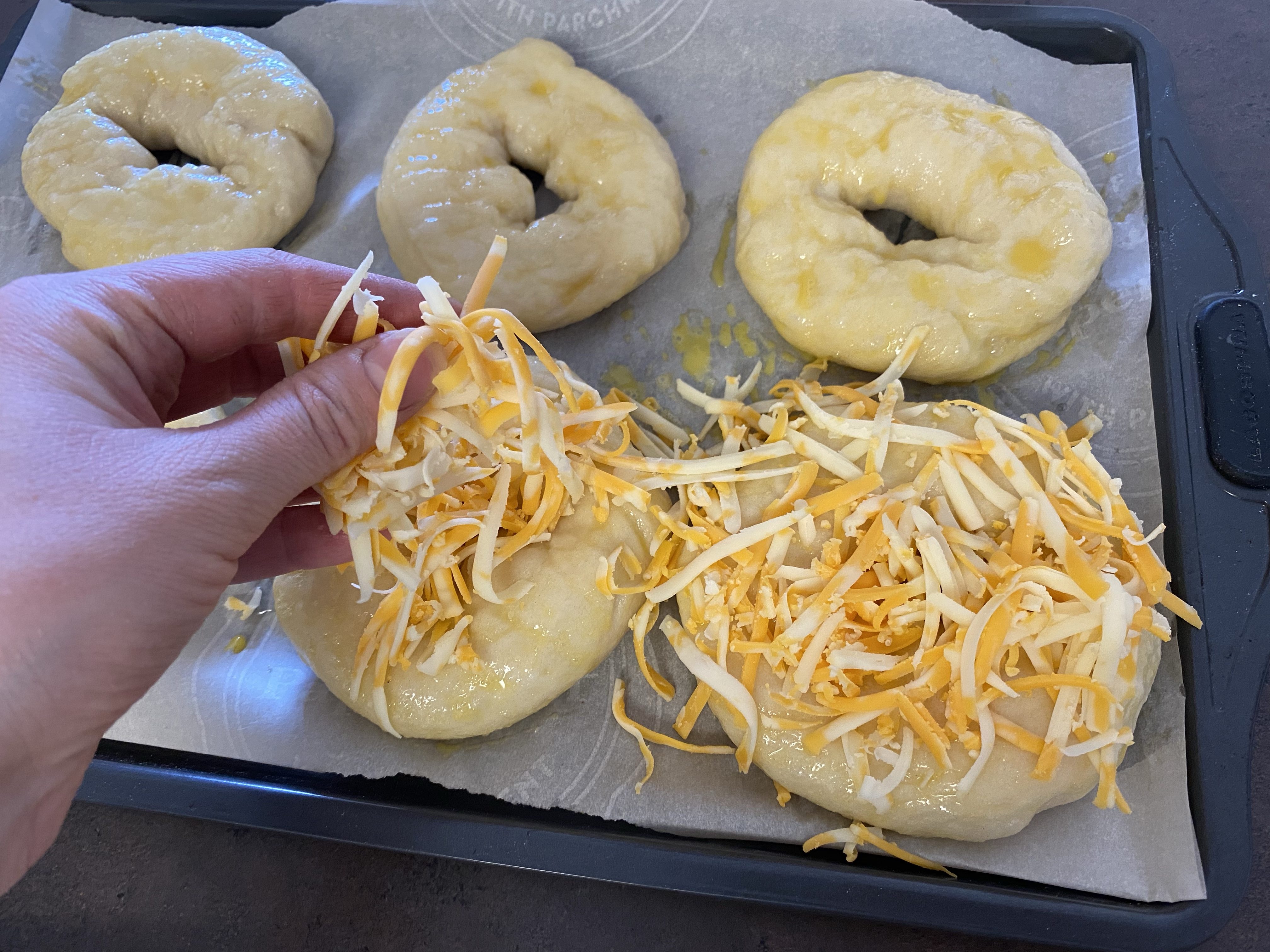- When all the bagels are back on the baking sheets, whisk up an egg and paint the bagels with a cooking brush. Put generous amount of shredded cheese on top (We like to use a nice cheddar, but have also used marble and mozzarella).