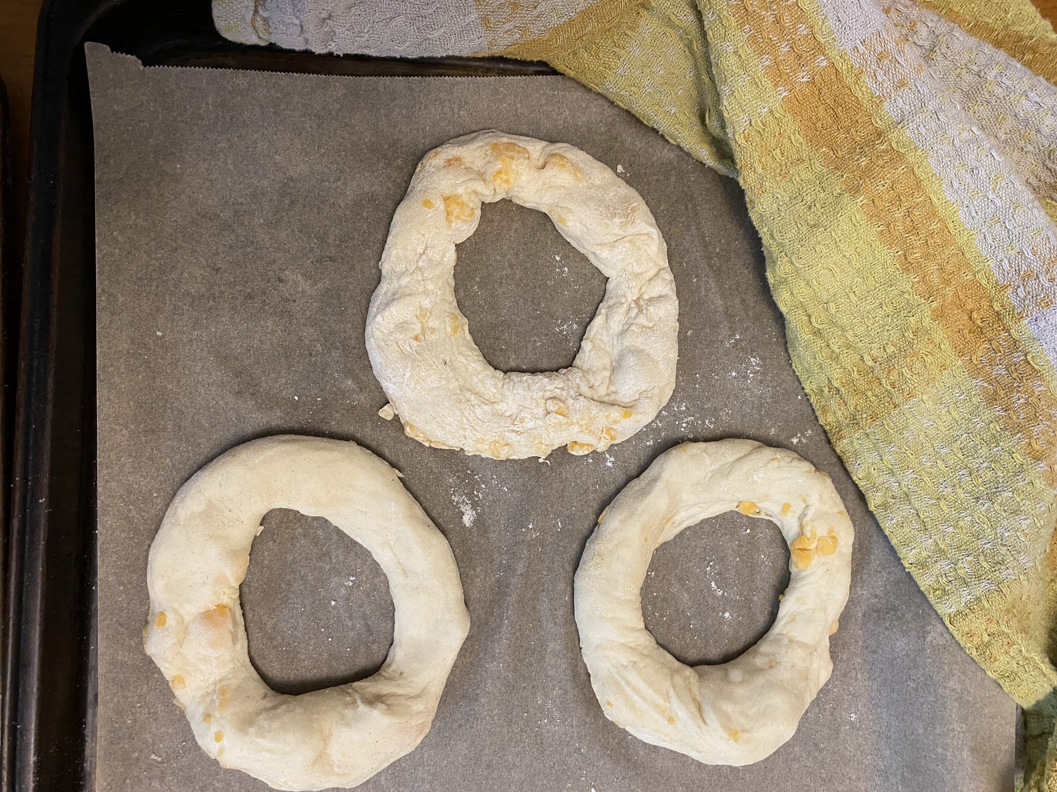 - Place on parchment-covered baking sheet and cover with a tea towel. Let rest for 1 hour. (Note that at this stage the bagels will expand and puff up, so thinner is good prior to resting. You can always gently stretch them before putting in the water bath too.)