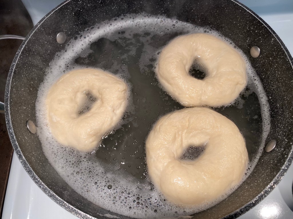 7. Boil 6 cups of water in a large pot and add baking soda and sugar. When it is a rolling boil, add 3-4 bagels gently with a large slotted spoon.