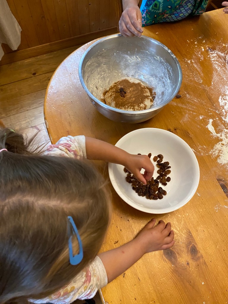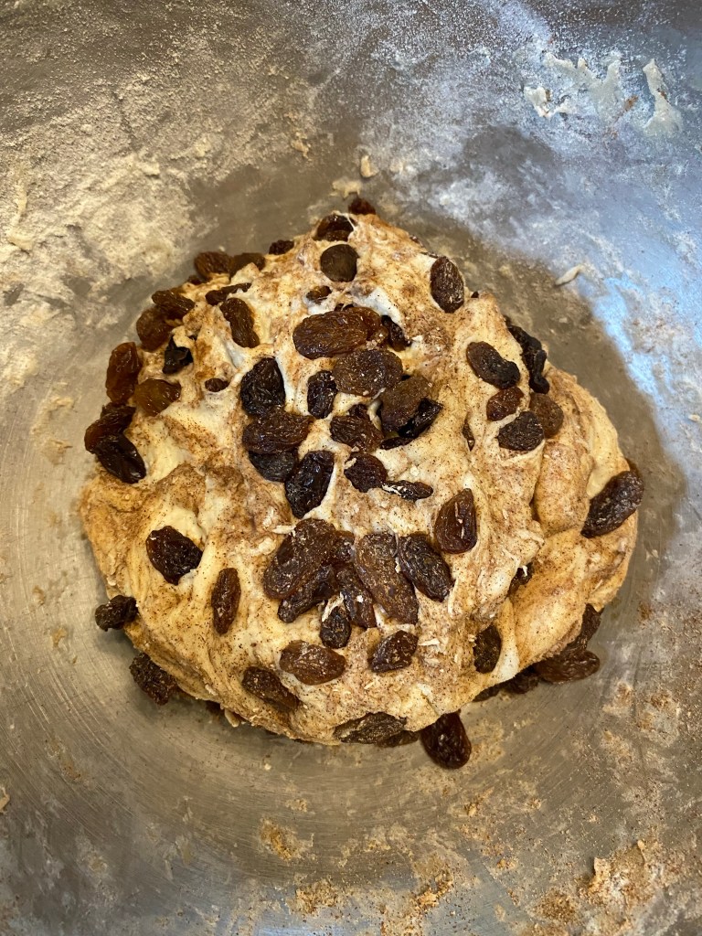 - Add 1 cup of raisins and 1 tablespoon of ground cinnamon to the bowl and work it into the dough. Knead dough on floured surface for 2 minutes until it is a soft ball. Divide it into 12 equal pieces.