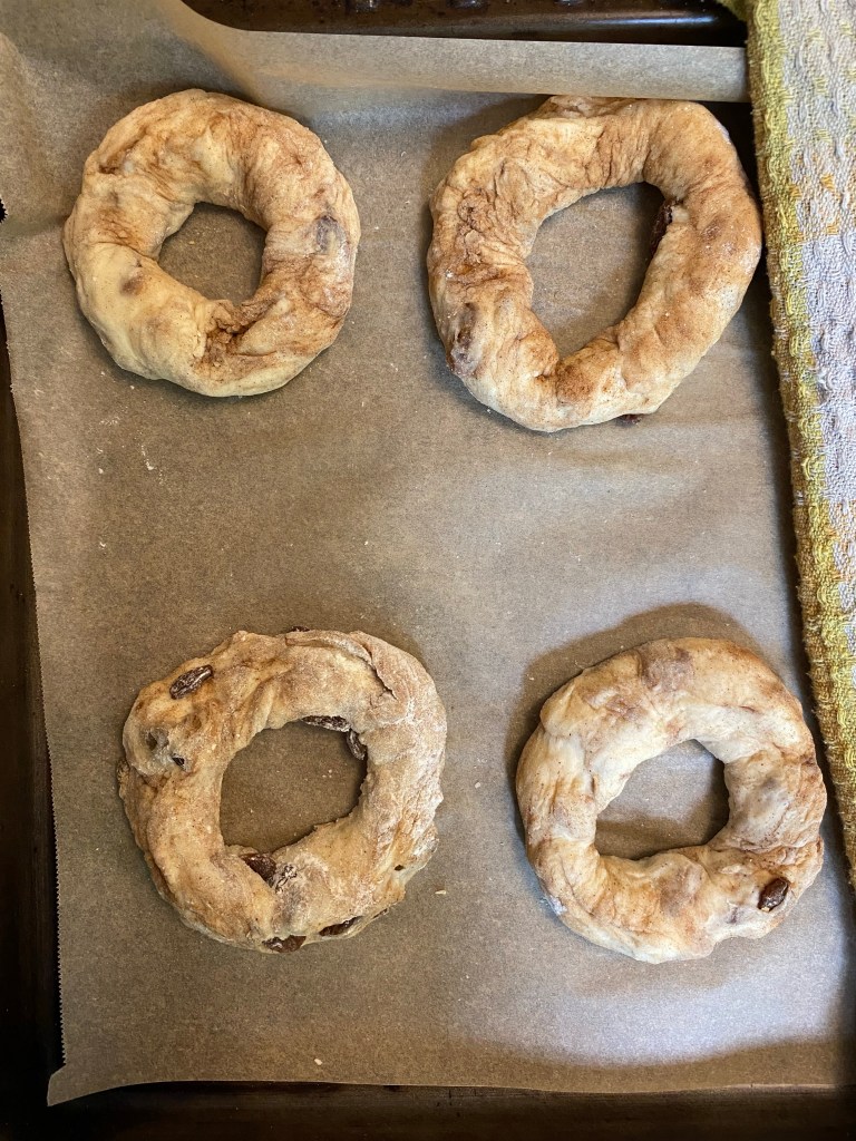 - Place on parchment-covered baking sheet and cover with a tea towel. Let rest for 1 hour. (Note that at this stage the bagels will expand and puff up, so thinner is good prior to resting. You can always gently stretch them before putting in the water bath too.)