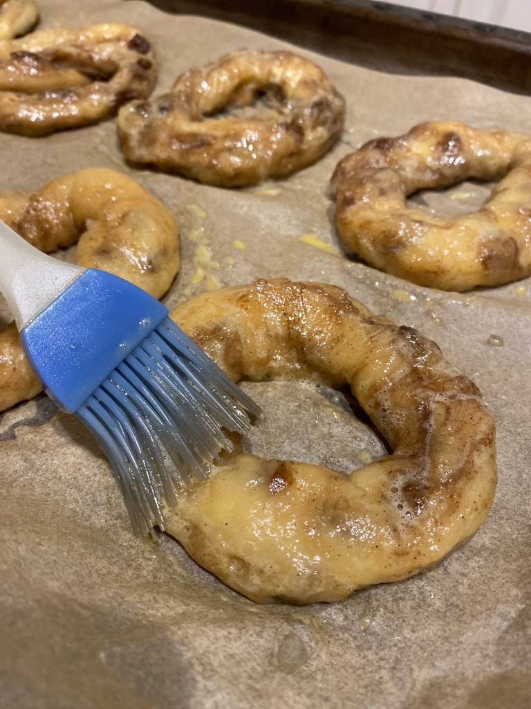 - When all the bagels are back on the baking sheets, whisk up an egg and paint the bagels with a cooking brush. (This will give them that lovely golden colour on the crust after being baked!)