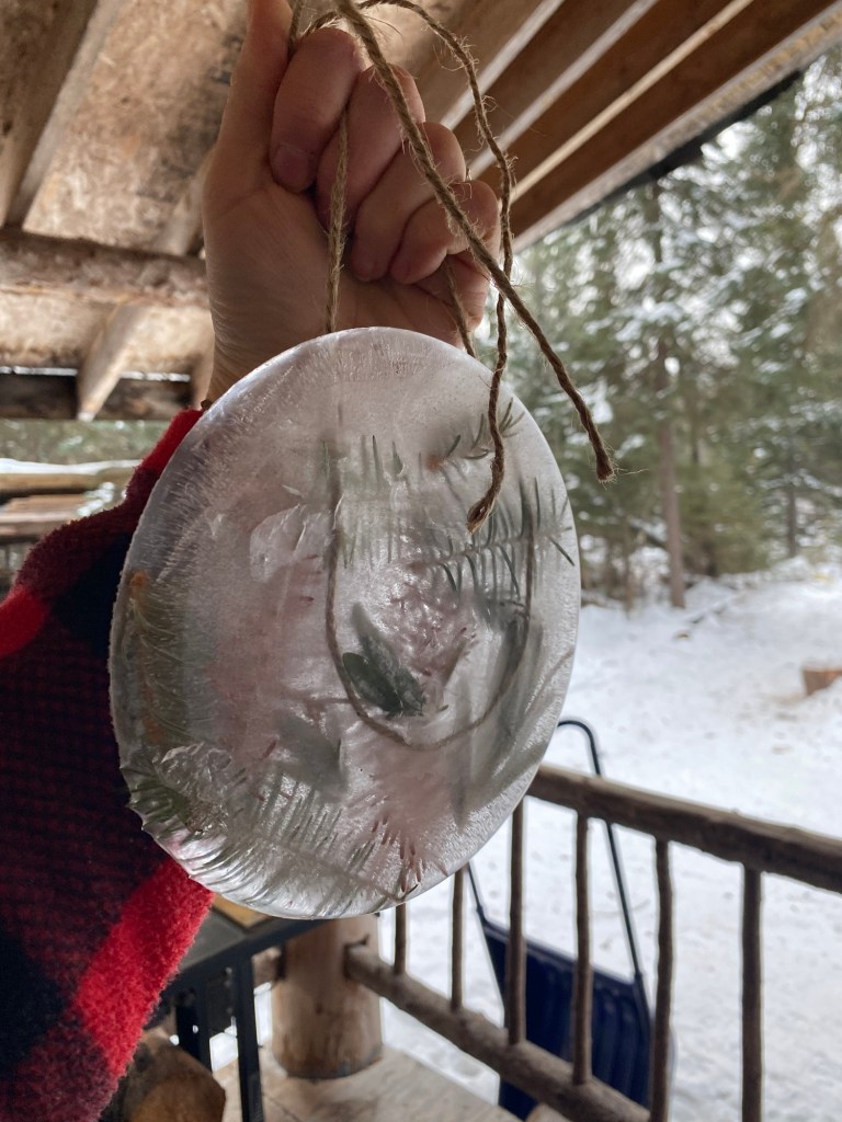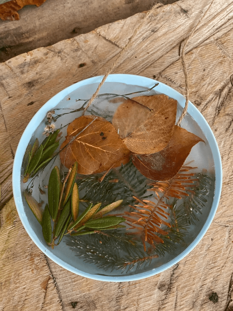 I love that we used natural items to do this activity, so that as it melts in the spring, the decorations frozen in the ice will decompose over time on the ground. We also used natural twine to hang it up that we found hanging around from previous visitors.