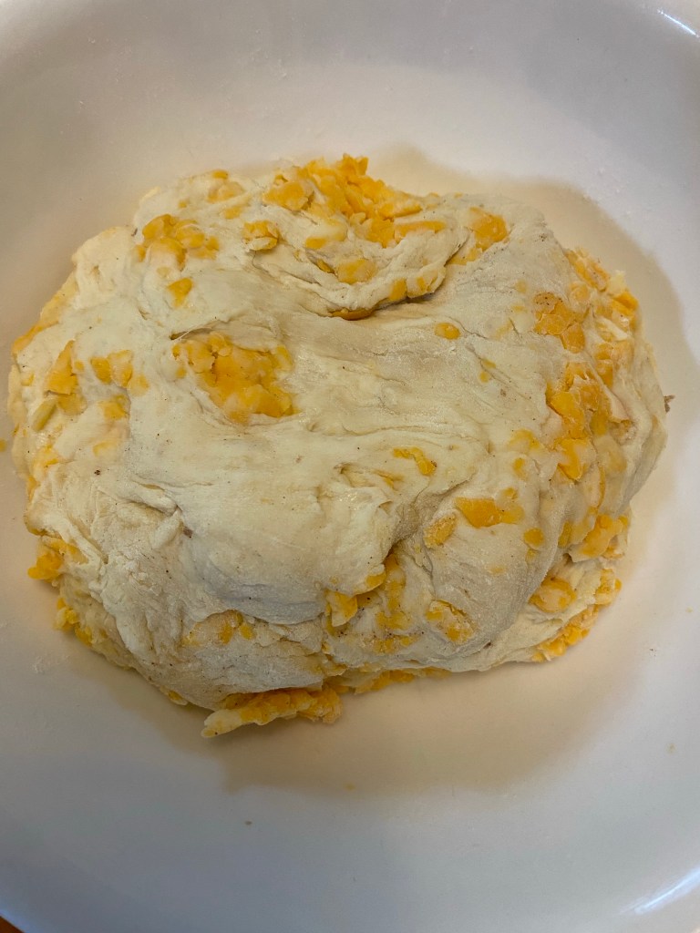 3. Add shredded cheese and knead dough on floured surface for 2 minutes until it is a soft dough ball. Form it into a “log” and divide and cut into 12 pieces.
