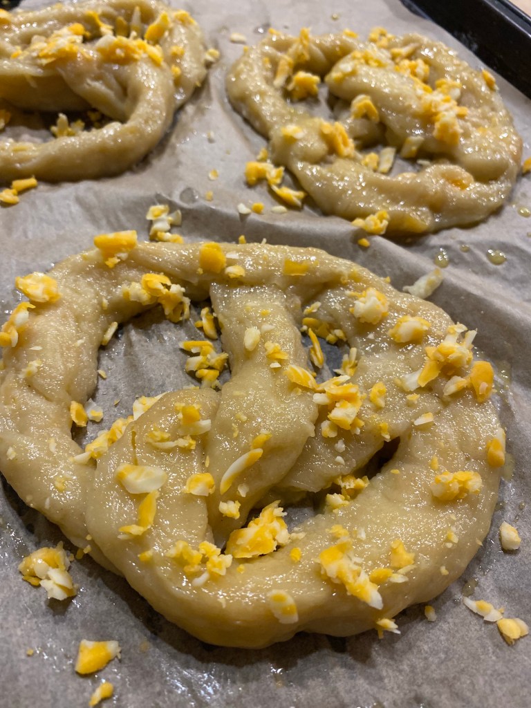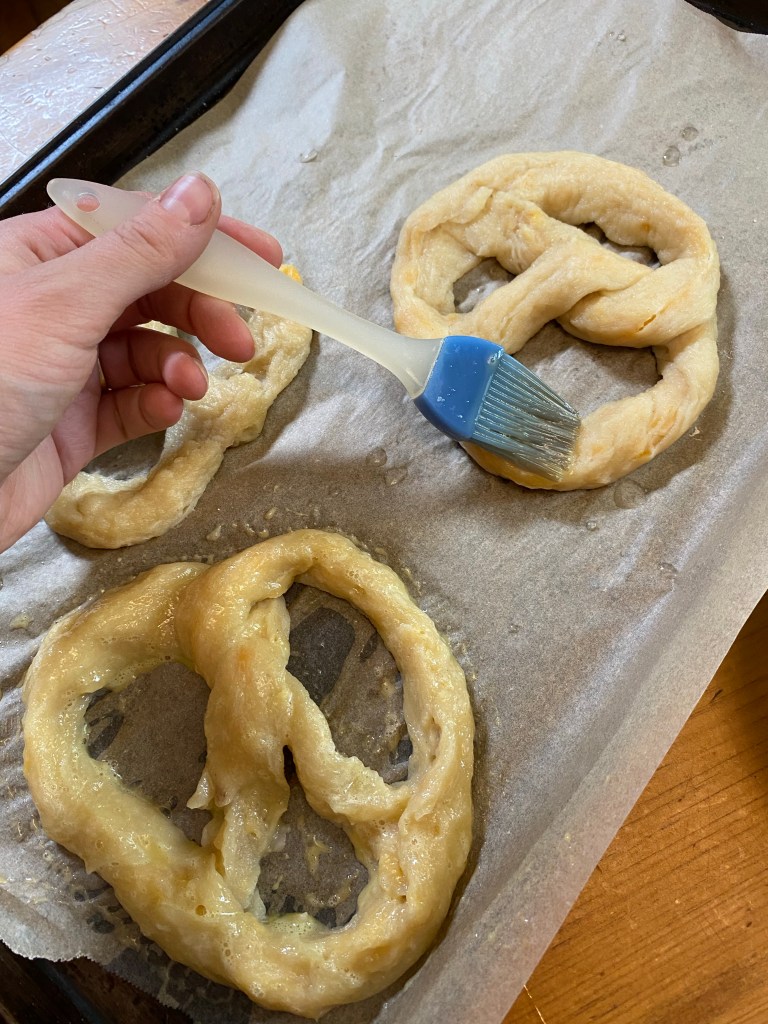 9. When all the pretzels are back on the baking sheets, whisk up an egg and paint the pretzels with a cooking brush. Sprinkle the tops with more shredded cheese.