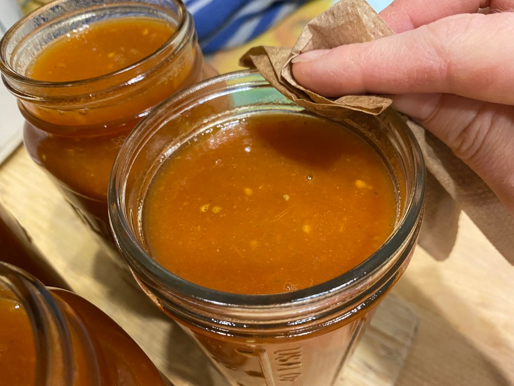 6. Wipe the tops of the filled jars with a clean/wet paper towel.