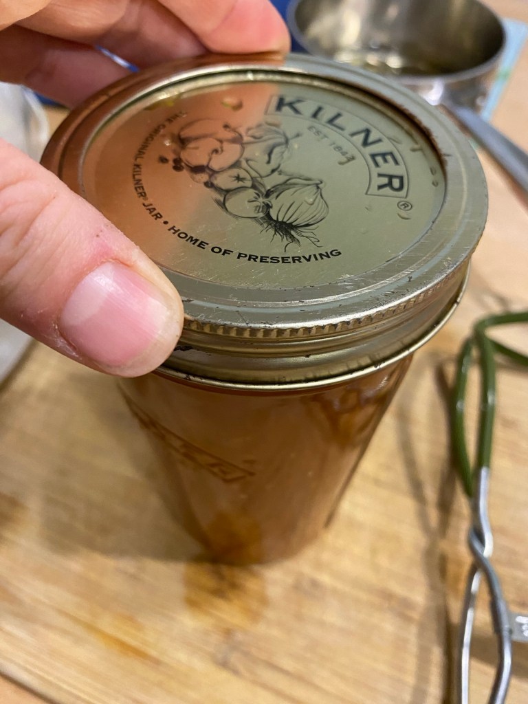 10. Lift jars from canner, being careful not to tilt. Place on towel-covered baking sheet and wait for the jar lids to start to “pop” as they naturally vacuum seal over the next little while.