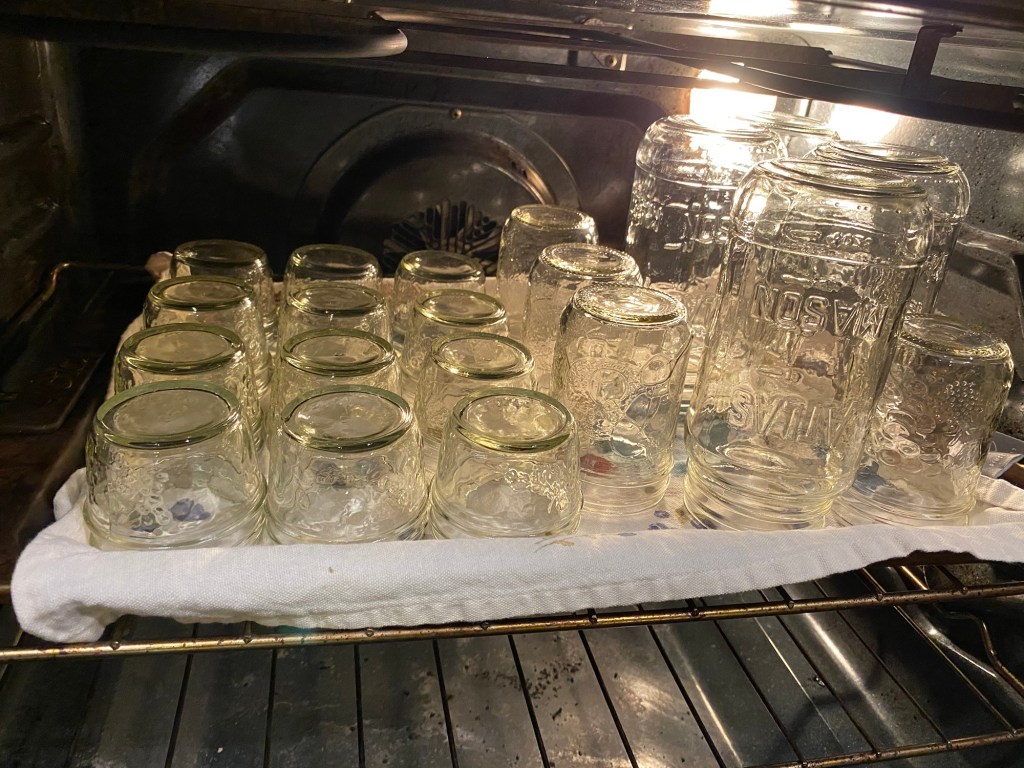 2. With canning tongs, pull out a few jars from the oven and make sure all supplies are ready for the canning stage.