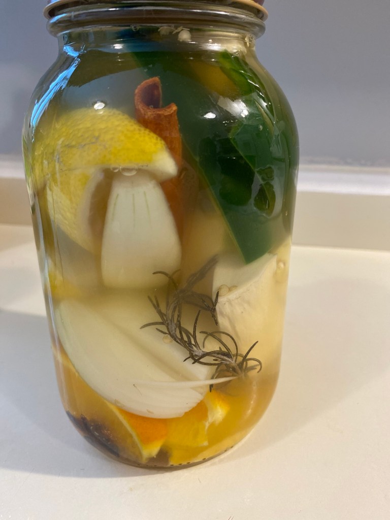 - Cut all fresh ingredients up and stuff into jars. Add spices in.