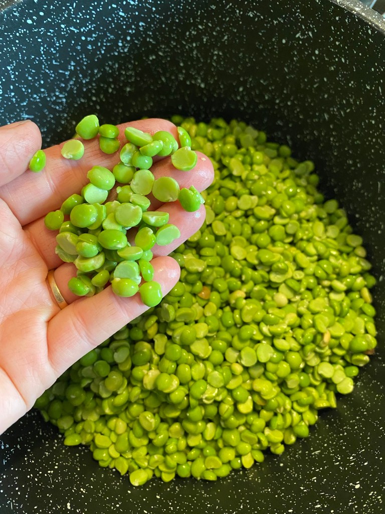 - Soak dry green split peas overnight in cold water. If this step is missed, start soaking for 4-6 hours before cooking soup, so that peas can still partially sprout. Rinse well in cold water. (See below for more information on why it is so important to soak peas and legumes)
