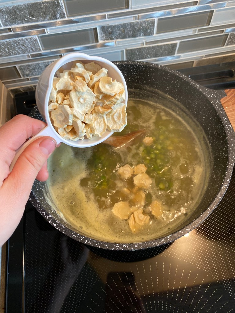 1. Soak dry green split peas overnight in cold water. If this step is missed, start soaking for 4-6 hours before cooking soup, so that peas can still partially sprout. Rinse well in cold water. (See below for more information on why it is so important to soak peas and legumes)
