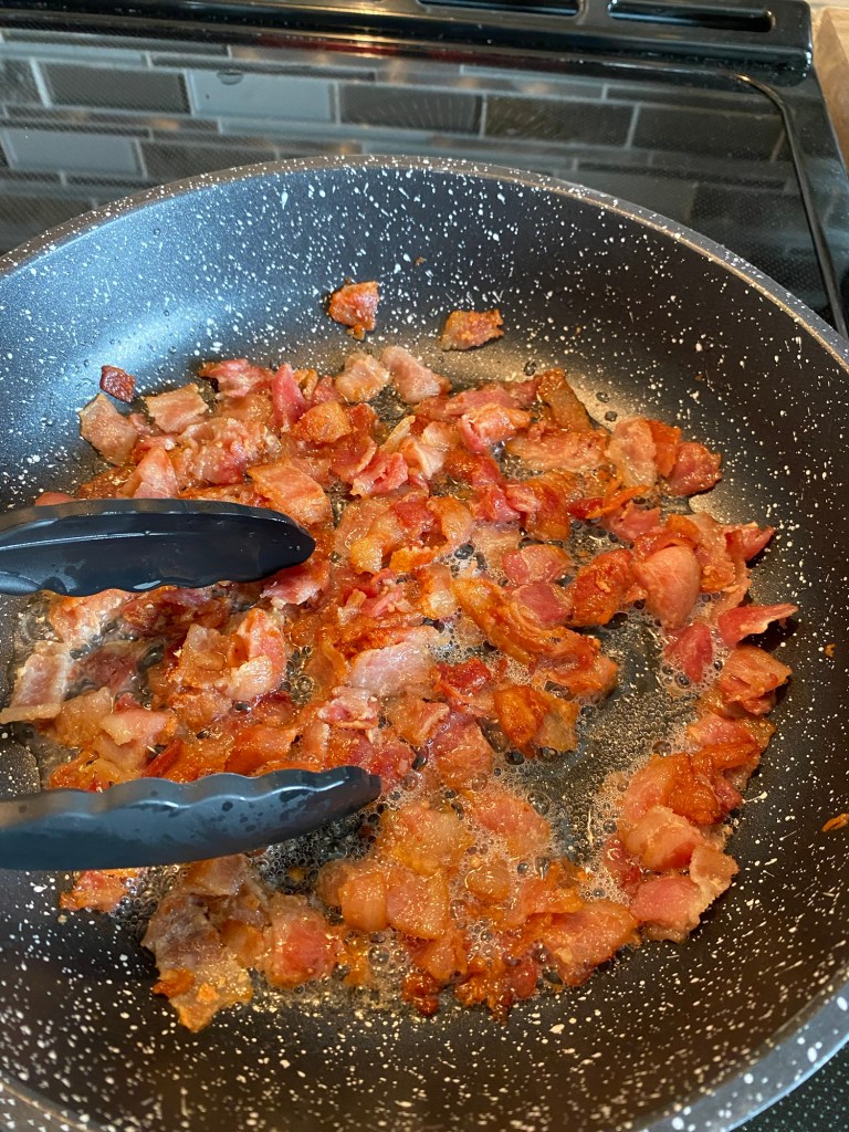 5. When soup is nearly done, cut bacon into small pieces and fry in separate pan until cooked through. (I use kitchen scissors, only reserved for cutting bacon!) Add to soup, along with a little tasty bacon grease (if desired!).