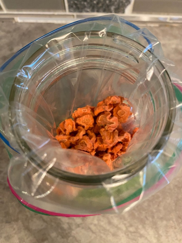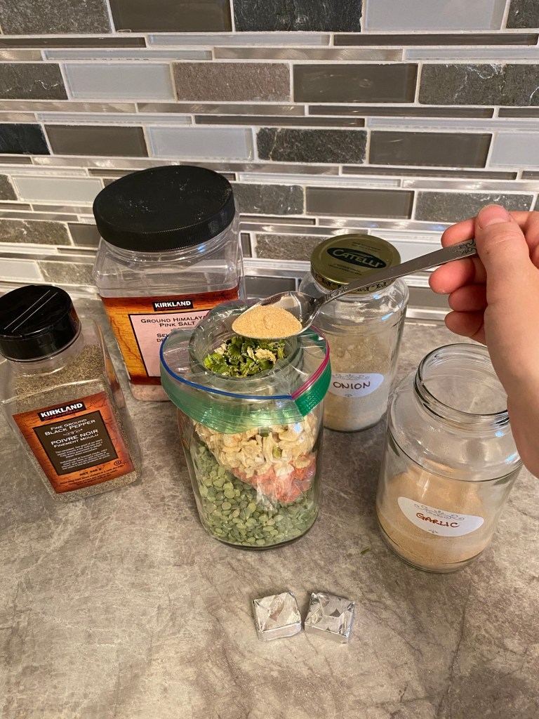 - Close ziploc bag, poke inside jar, and place stock cubes on top. Seal jar with lid.