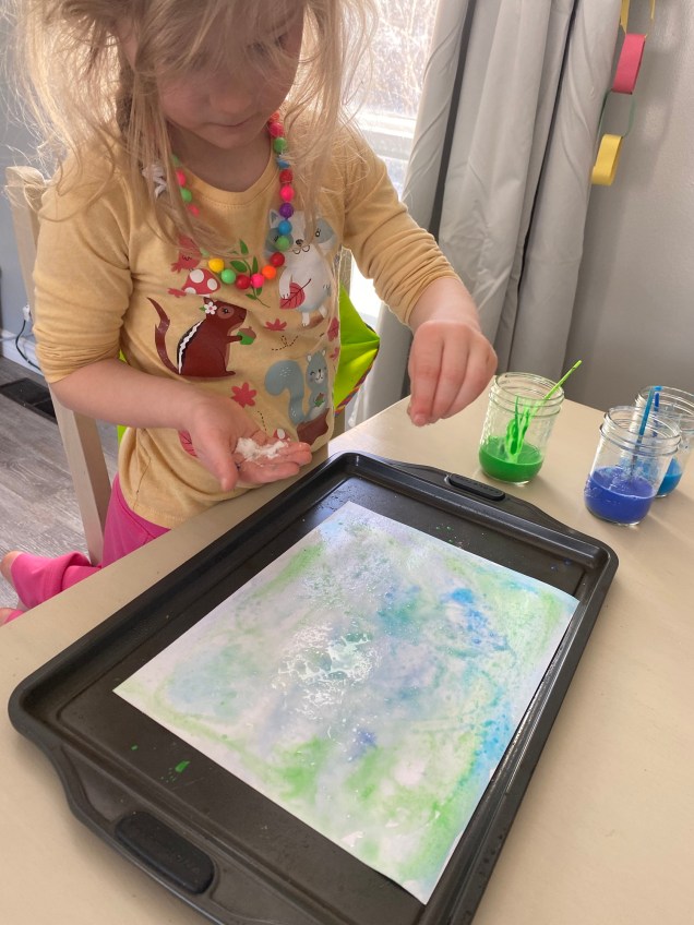 My kids loved doing this freestyle watery painting and then getting to sprinkle it with table salt. It left a textured feel to the painting, as well as altering the colours while the salt dried on the wet paper.