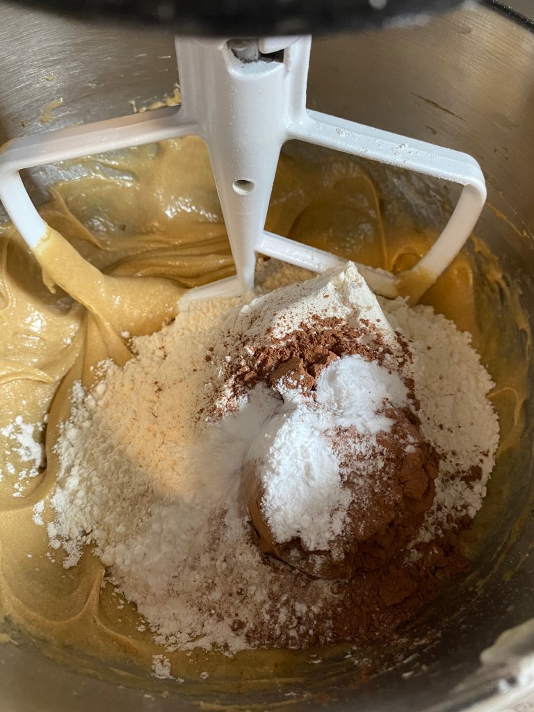 In a large bowl, cream the butter and sugars together. Add the eggs, vanilla and sourdough discard and mix well.