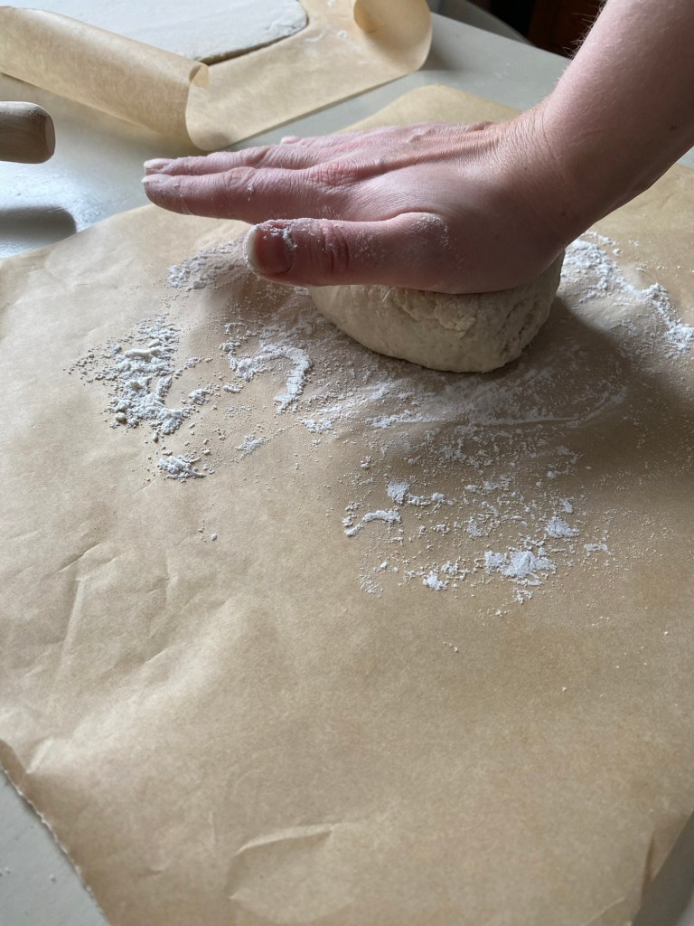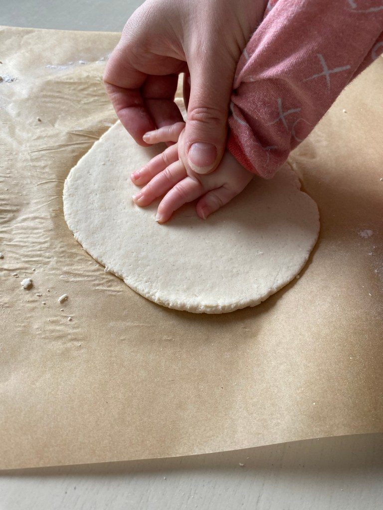 Divide into 2 balls and roll out to 1/4” thick (or about 1/2 centimeter). *You can try putting a flattened ball between two sheets of parchment paper with flour and rolling it this way, or just flour up a surface and roll out, adding flour as you go. (Try not to add too much flour, just enough so that it doesn’t stick to the parchment or pin!)
