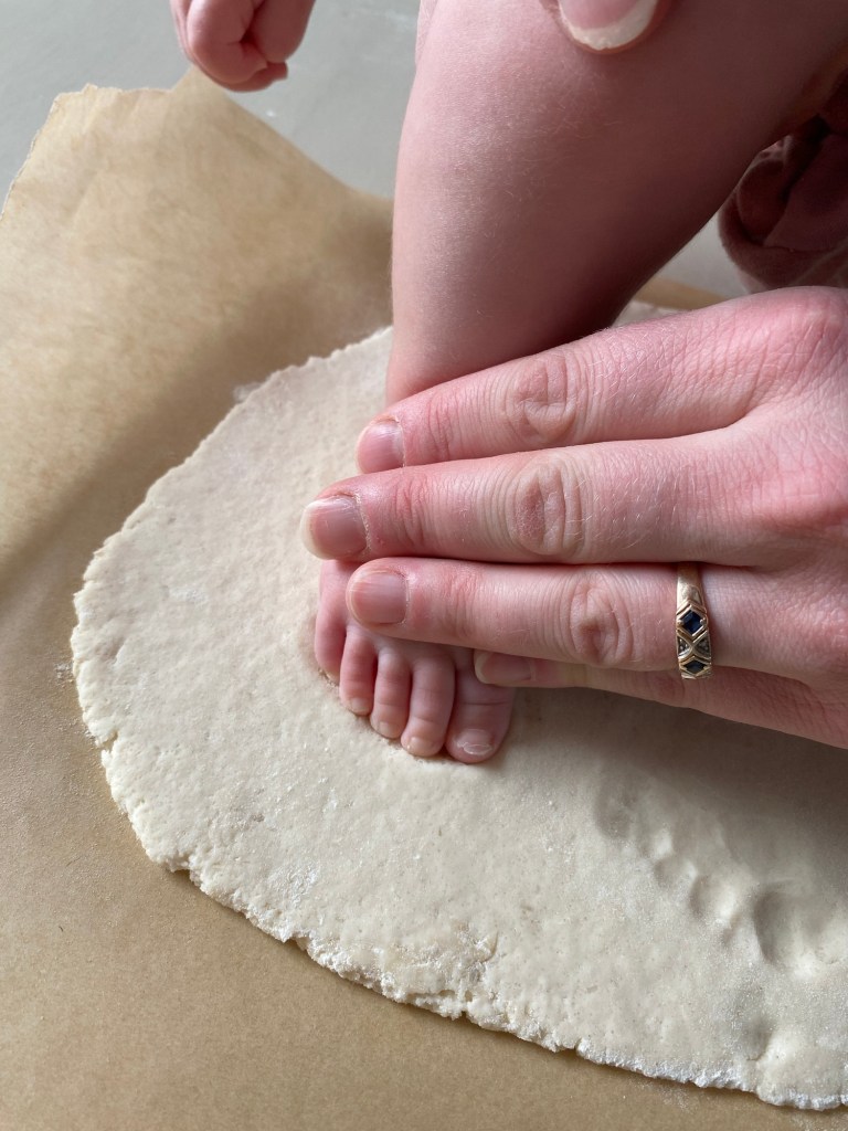 It’s not always easy to try to get wriggling toes or tiny squirming fingers to cooperate for this craft, so I definitely suggest having someone help hold your little one still while you gently push their feet or hands into the rolled out and ready dough!