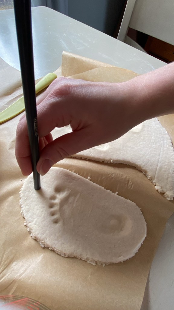 Use dull knife or large cookie cutter to cut out baby’s print. Gently place on a parchment covered baking sheet, spaced out evenly with other baby prints.