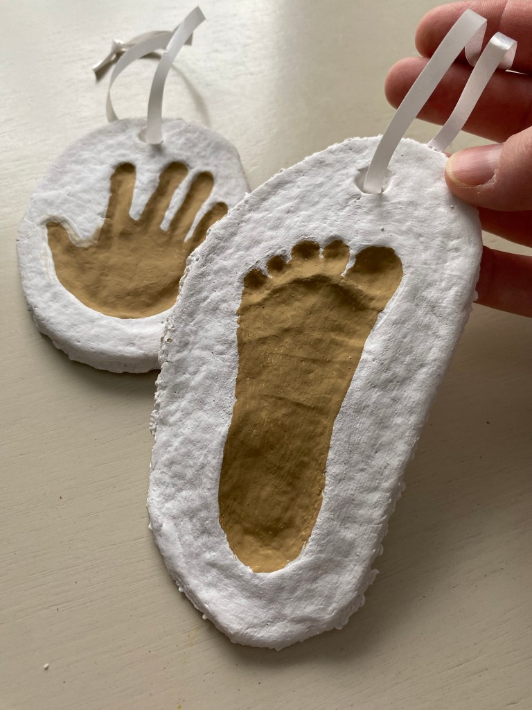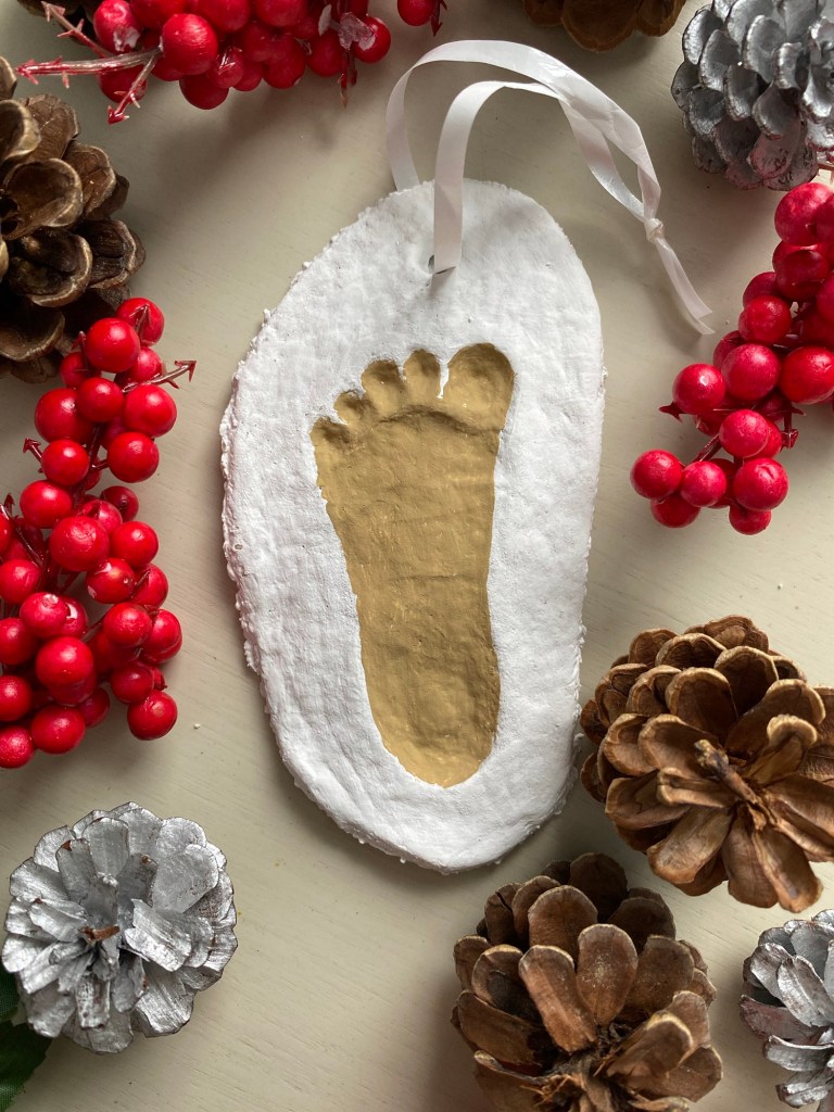 With each baby that we’ve had, we have this lovely tradition to make a salt dough imprint of their tiny feet or hands every Christmas and turn it into a special ornament for our Christmas garland.