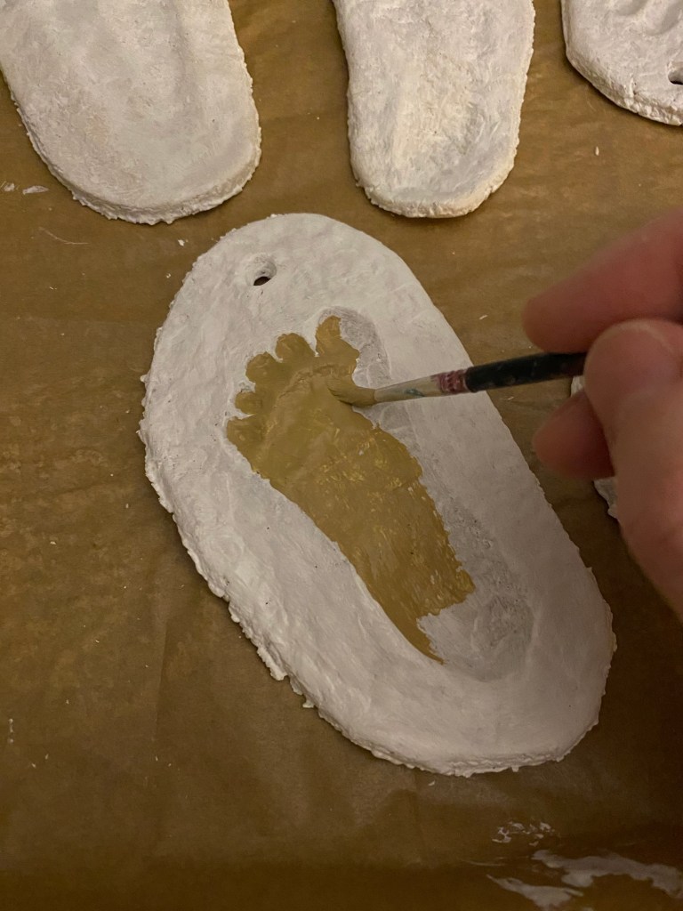 12. When fully cooled (or the next day!) you can use acrylic paint if desired to paint the baby’s imprint area so it can be seen better, and decorate however you like. I also painted the backs once the front side had dried.